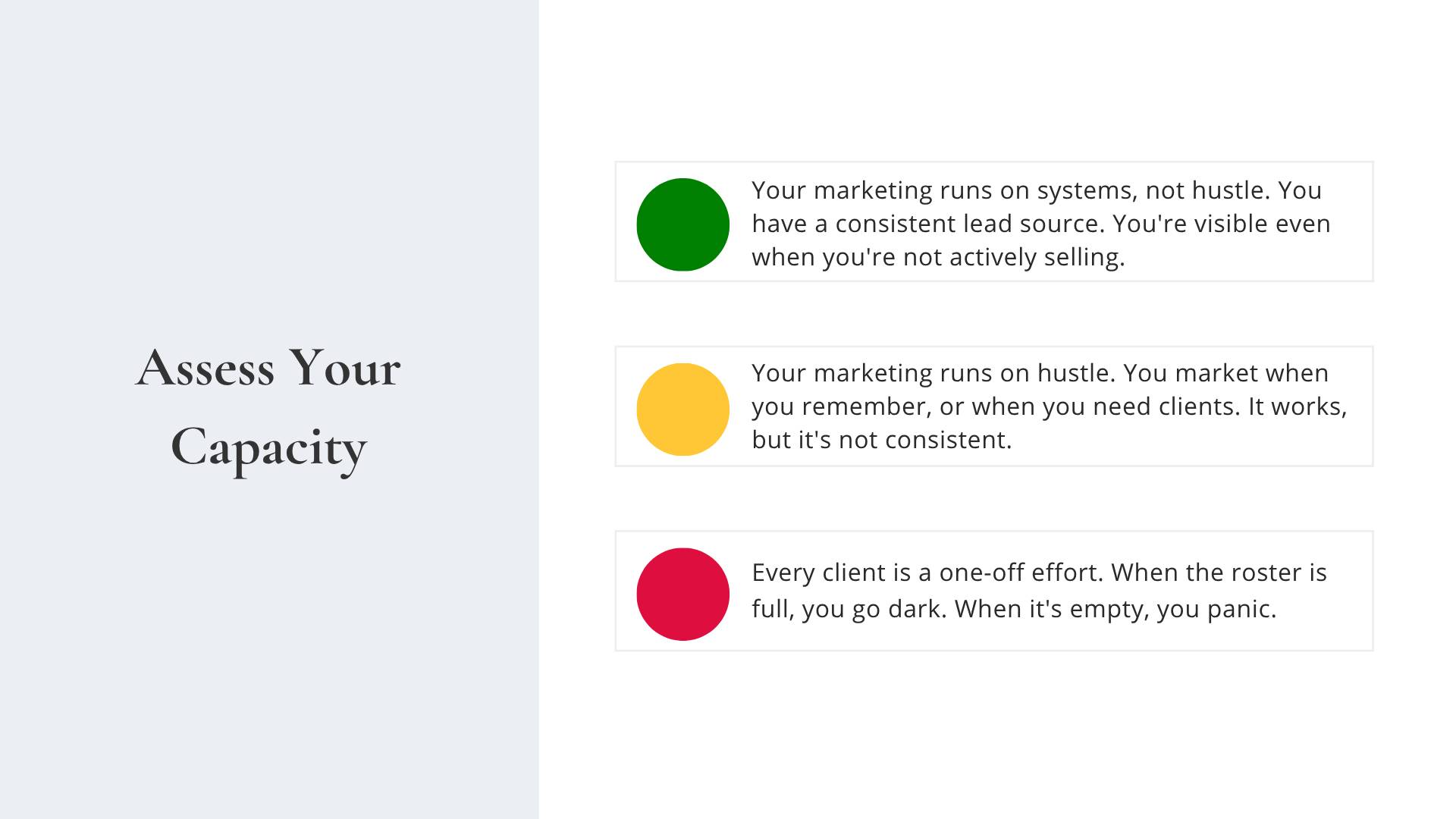 Hey Reader, During The CEO Ceiling Assessment, I asked the women on the call to name which of the five areas was their biggest red - the actual bottleneck in their business. Five out of seven said the same thing. ​Marketing Stability.​ I wasn't surprised. I've run some version of this assessment for years now, and marketing is almost always where women say they're most red. But here's what I want you to really hear - because this is the insight most business owners miss: Something drains your emotional or cognitive capacity first. A hard season. A sick kid. A chronic illness flare-up. A parent in crisis. You are stretched to thin. Your own burnout catching up to you. You stay operational. Of course you do, you're a badass CEO! We know how to dig deep and keep going. But at some point, something has to give. And the thing that gives, almost every time, is your marketing system. Because marketing doesn't scream at you today the way client deadlines scream. A newsletter you didn't write this week doesn't send you an angry email. So you let it slide. For a week. Then two. Then a month. Here's what most people don't connect: The business you have today is the result